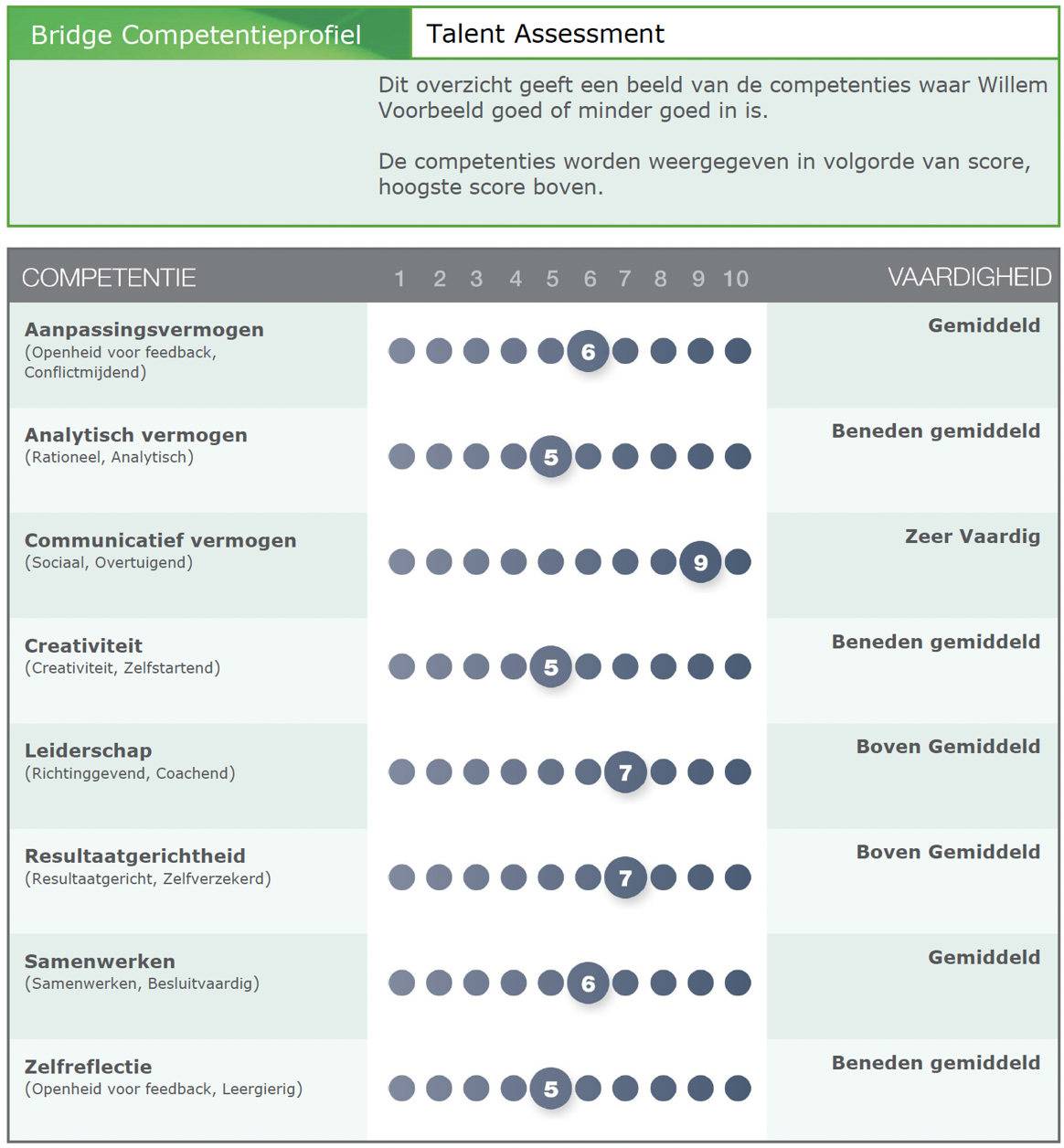 Bekijk hier het voorbeeldrapport van het online assessment. In dit rapport zie je de scores op 34 Big Five-competenties. Deze competenties zijn breed inzetbaar en sluiten aan bij vrijwel elke functie. Het online assessment is daarmee ideaal voor werving, selectie en HR-toepassingen.