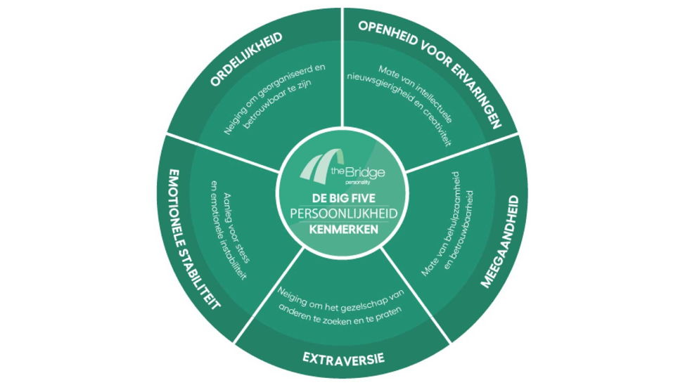 The Bridge Personality is al 15 jaar de meest toegepaste Big Five persoonlijkheidstest in de Nederlandse en Belgische markt. Deze test, gebaseerd op de Big Five theorie, wordt algemeen beschouwd als de ultieme persoonlijkheidstest voor werving en selectie doeleinden. De theorie onderstreept dat persoonlijkheid is opgebouwd uit vijf primaire eigenschappen, de zogenaamde Big Five, die samen de vijf persoonlijkheidsfactoren vormen.