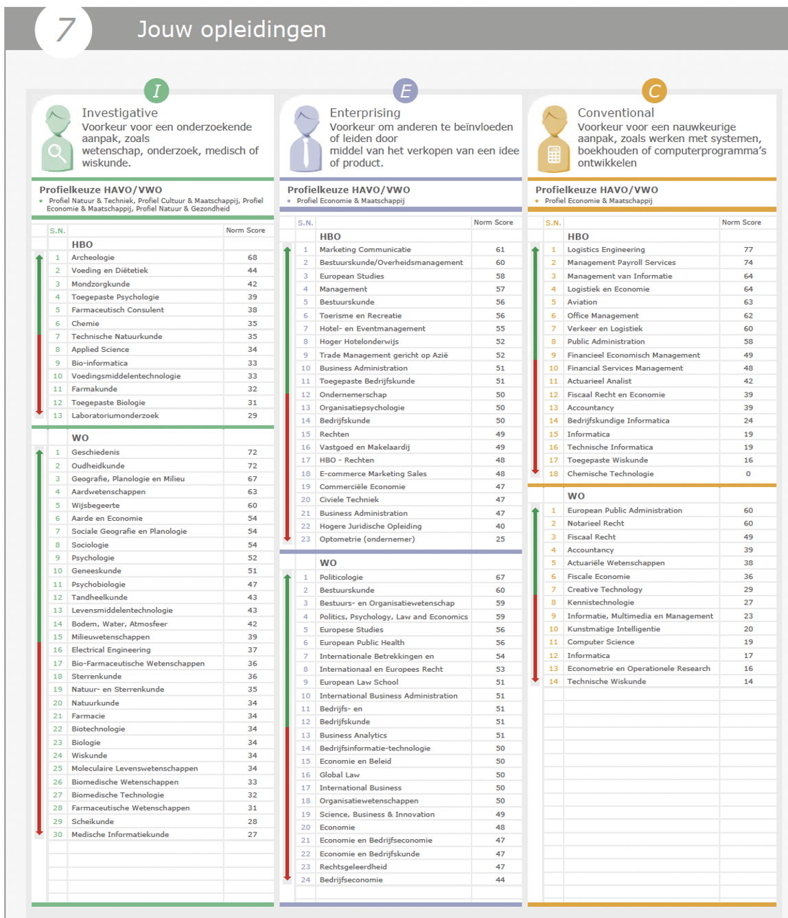 Bekijk hier een voorbeeldrapport van de test voor het kiezen van een havo of vwo profiel. Dit is de hbo-/wo-versie, in het rapport staan scores op vrijwel alle hbo- en wo-beroepen. Daarnaast wordt de voorkeur op alle hbo- en wo-opleidingen in Nederland weergegeven, van hoog naar laag. Bij alle voorkeuren wordt ook het havo/vwo profiel weergegeven.