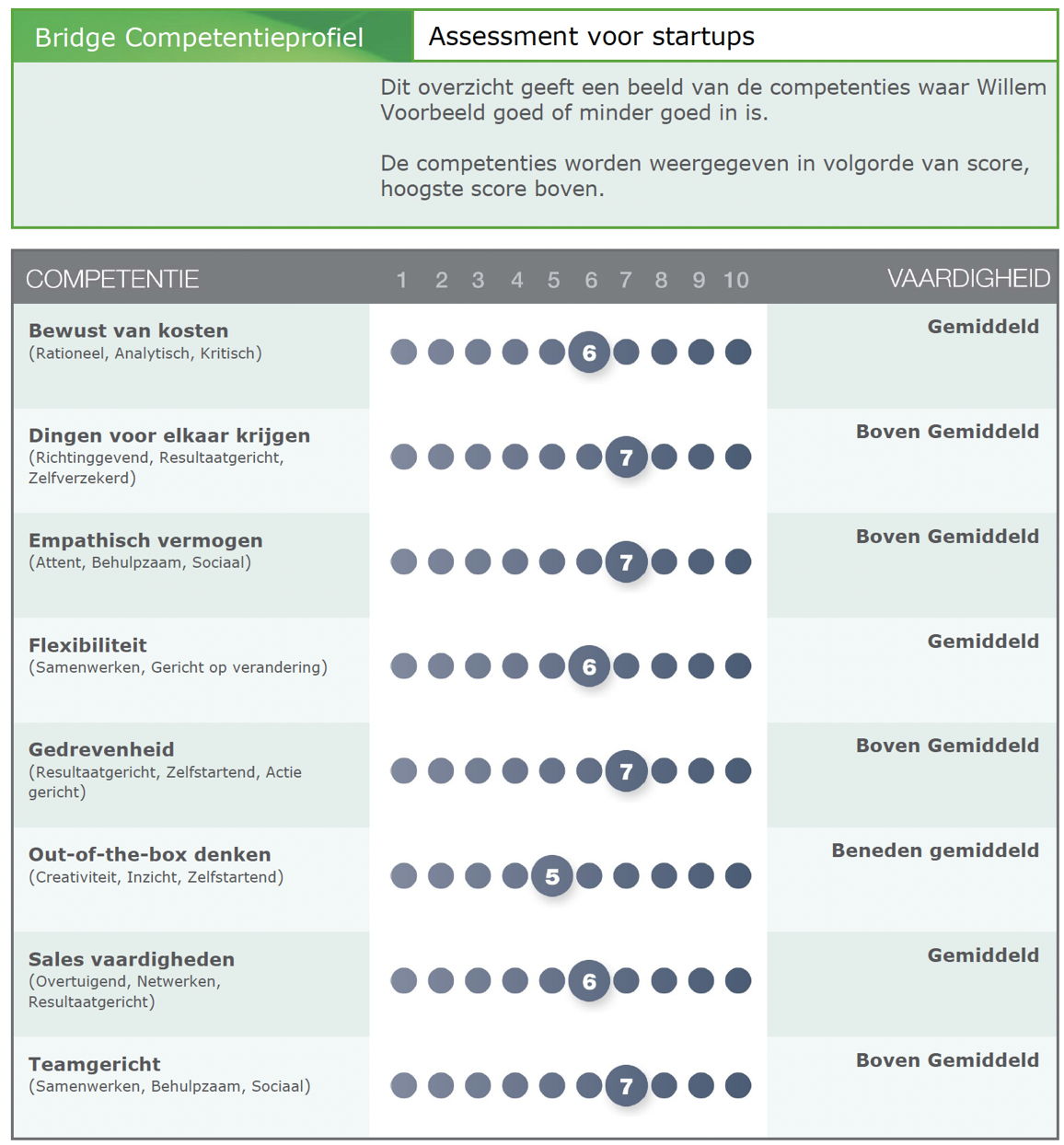 Je kunt hier een compleet voorbeeldrapport van het online assessment voor startups inzien. Op de laatste pagina van het rapport staan 8 specifieke competenties die voor werken bij een startup van belang zijn.