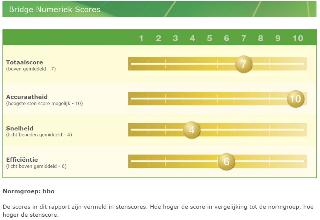 Je kunt hier een voorbeeldrapport van de numerieke intelligentietest op hbo-niveau bekijken. Deze test maakt gebruik van een Nederlandse hbo-normgroep. Er is ook een mbo- en een wo-/master-versie van deze test beschikbaar. Het rapport laat enkel de resultaten zien van het numerieke deel van de IQ-test. Er zijn ook aparte rapporten beschikbaar voor de verbale intelligentietest en de abstracte intelligentietest. Het rapport toont de totaalscore van de test, evenals de scores op accuraatheid, snelheid en efficiëntie. Bovendien wordt er aangegeven of de persoon tijdens de professionele IQ-test heeft gegokt.