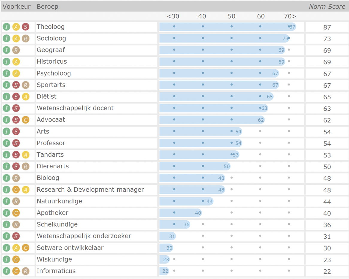 Bekijk hier een voorbeeld van een studiekeuzetest voor de Radboud Universiteit. Het rapport toont je scores op 200 wo-/master-beroepen en rangschikt je voorkeuren voor 134 wo-/master-studies van hoog naar laag. Deze studiekeuzetest is genormeerd, wat betekent dat jouw scores worden vergeleken met die van 500 andere wo-/master-studenten. Dankzij deze wetenschappelijke benadering kan precies worden bepaald welke studie het beste bij jou past.